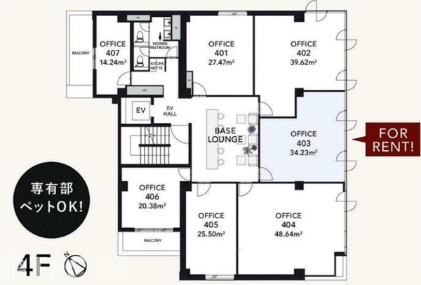 共用サービス:ラウンジ、会議室、Wi-Fi、給湯、エレベーター、カフェ、駐輪場、郵便受け、トランクルーム、荷物受け、ロッカー
