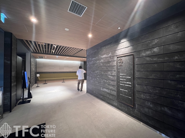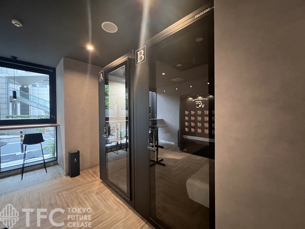 エントランスにはコミュニケーションスペースやテレワークブースがあり、うれし設備が整っています。